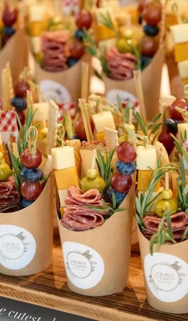 Each cup will include 1-2 meats, cheeses, fruit kabob, small bread stick or cracker, large olive