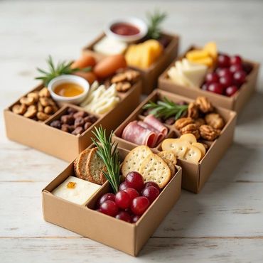 Selection of 2 meats, 2 cheeses, fresh & dried fruit, crackers, nuts, olives, sweet treat