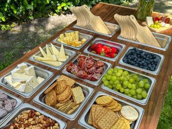 Selection of 2 meats, 2 cheeses, fresh & dried fruit, crackers, nuts, olives, sweet treat